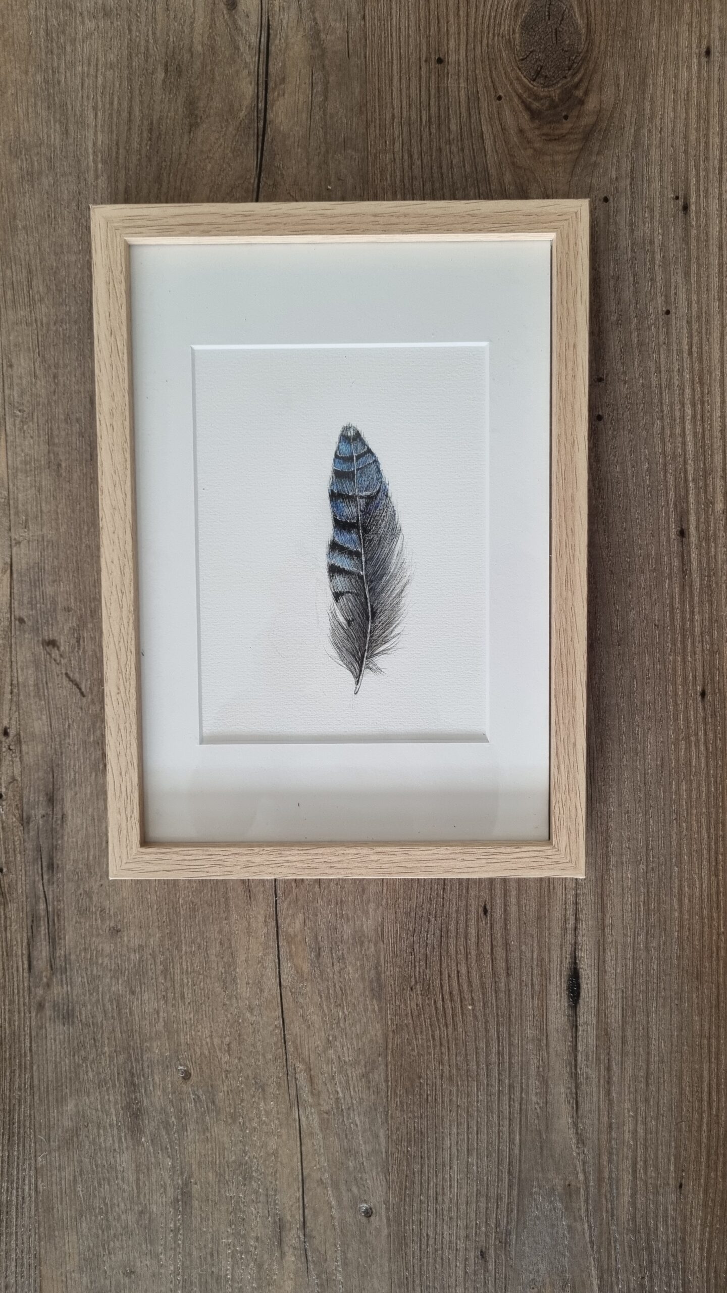 Aquarel veer Vlaamse gaai. Fijn gedetailleerde kleine aquarel van de Vlaamse gaai, een combinatie van fineliner en aquarel. aquarel inclusief wissellijst.