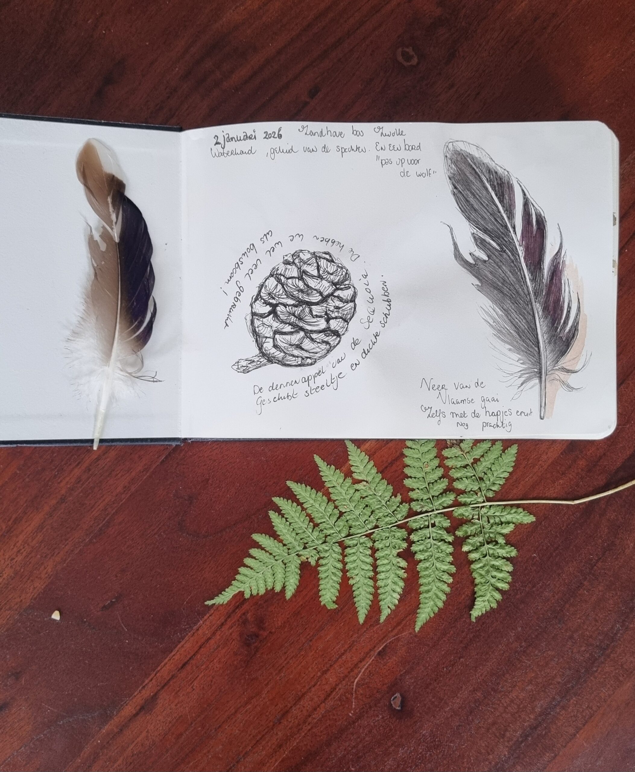 Natuurjournaling is een heerlijke hobby die je helpt om je meer verbonden te voelen met je omgeving. Je leert vragen stellen, details opmerken en je bevindingen op jouw manier vastleggen. Elke pagina wordt een mini‑expeditie: een blad die je opvalt, een vogel die je hoort, een vondst op de bosgrond, een verandering in het seizoen. Alles mag mee je natuurdagboek in.